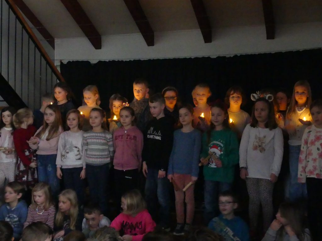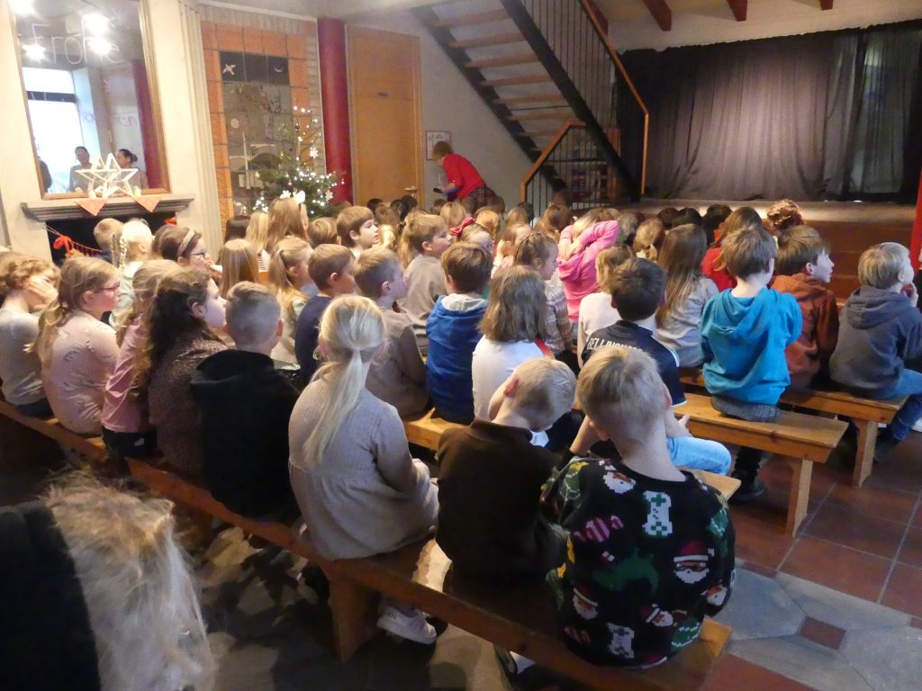 Am letzten Schultag traf sich die ganze Schule traditionell im Dorfgemeinschaftshaus, um in einer kleinen Feier das Kalenderjahr zu beschließen und uns auf die kommenden Weihnachtsferien einzustimmen. Jeder Jahrgang führte kurze Lieder oder Sketche auf und gemeinsam sangen wir die Lieder des Gottesdienstes und erinnerten uns an die Reise des kleinen Esels, der nun bald an der Krippe ankommen wird.
